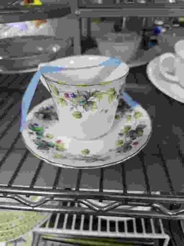 This is a vintage fine bone china tea cup and matching saucer produced by Andrea by Sadek. The set features a classic white translucent body with a tapered tea cup silhouette and a traditional flared saucer. The exterior is decorated with a vibrant botanical motif consisting of purple and blue grapes, accented by lush green foliage and delicate pink floral sprigs. The rim of both the cup and the saucer is finished with a hand-applied gold-toned gilt banding, which adds a decorative elegance common in 20th-century ceramic ware. The handle of the cup (partially obscured) appears to be a standard ear-shape, likely also accented with gilding. Although the manufacturer's mark is not visible in the photograph, the user-supplied context identifies it as Andrea by Sadek, a company known for importing high-quality Japanese porcelain since 1936. The style suggests a late 20th-century production, characterized by high-gloss glazing and crisp decal application. The overall condition appears good with no visible cracks or large chips, though a blue ribbon is currently being used to secure the pieces together, necessitating closer inspection for minor surface scratches or gilding wear once removed. The craftsmanship displays the delicate thinness and translucency associated with bone china, indicating a higher quality of household decorative arts.