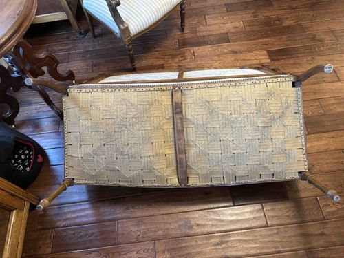 This image displays the undercarriage and structural assembly of a French Louis XVI style settee or canapé, shown upside down on a dark wood floor. The frame is constructed from solid wood, featuring four elegant cabriole legs with carved transitions. The seat support highlights traditional upholstery techniques, specifically a dense lattice of interwoven jute or burlap webbing. This webbing is secured to the frame with numerous rusted or oxidized metal upholstery tacks. A central support stretcher runs vertically through the middle of the frame to provide additional stability. The webbing is further reinforced with a series of cross-stitched twine patterns, indicating a high level of manual craftsmanship intended to support internal springs. The wood shows a warm, aged patina with visible grain. Condition issues include significant wear to the underside finish, numerous small holes from previous re-upholstery efforts, and light fraying of the textile components. The style suggests a late 19th-century or early 20th-century revival piece, exhibiting classical proportions and traditional joinery. Small plastic glides have been added to the base of the feet for modern floor protection.