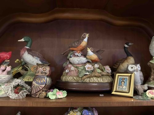 This miniature collectible features a genuine or reproduction 1961 4-cent United States postage stamp commemorating the nursing profession, housed within a small, rectangular gold-toned brass or metallic frame. The stamp itself depicts a nurse in a traditional white uniform and cap, centered against a blue background with the word 'NURSING' at the base. The frame appears to have a polished finish with minor surface oxidation consistent with age. This piece is part of a larger collection of avian-themed porcelain figurines, including a notable Robin family nesting scene and a stylized Mexican-style owl. The nursing miniature stands approximately 2-3 inches tall and is designed for tabletop display. Regarding condition, the paper of the stamp shows slight yellowing, and the metallic frame retains its structural integrity without significant denting. These types of framed stamps were popular mid-century gift items for healthcare professionals. The craftsmanship level is indicative of mass-produced collectible decor from the late 20th century.