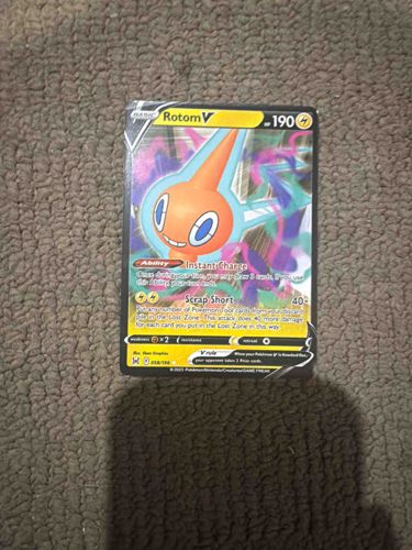 This is a Rotom V holographic trading card from the Pokémon Sword & Shield: Lost Origin expansion set. The card features the character Rotom, depicted as a plasma-based orange and light blue entity surrounded by dynamic purple and pink energy effects. As a 'V' rarity card, it boasts a full-art graphical style where the illustration occupies most of the surface area, extending beyond the traditional character window. The card lists '190 HP' and features the 'Instant Charge' Ability and the 'Scrap Short' attack. Physically, the card is standard TCG size (approximately 2.5 x 3.5 inches) with rounded corners. Based on the bottom left identifiers, it is numbered 058/196 and was illustrated by 5ban Graphics. The card bears a 2022 copyright date. In terms of condition, there is visible whitening and edge wear along the top and left borders, as well as minor corner fraying, indicating it has been handled and is not in 'Gem Mint' condition. The surface shows some light scuffing but retains its original holographic sheen. The centering appears slightly shifted toward the top left corner.