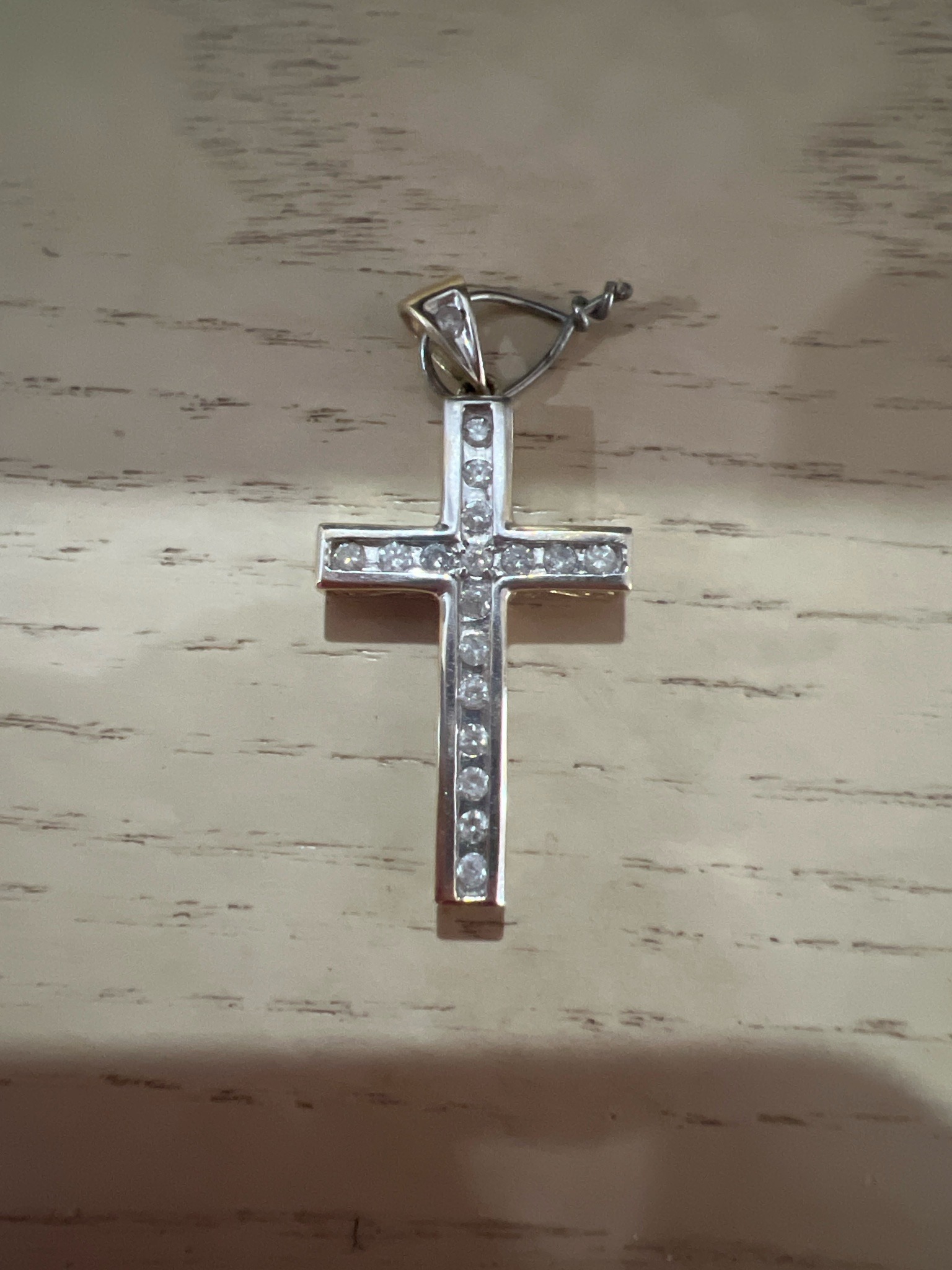 This item is a contemporary Latin cross pendant featuring a two-tone metal construction, likely 14k white gold over yellow gold or sterling silver with gold accents. The front face is channel-set with central round brilliant-cut gemstones, possibly diamonds or high-quality cubic zirconia, which run vertically and horizontally across the arms. The primary body of the cross has a polished white metal finish, while the visible side edges and the integrated bail show a yellow gold-toned contrast. The bail is uniquely triangular and features an additional inset gemstone, connected to a secondary silver-toned loop for chain attachment. The piece displays a modern, clean-lined aesthetic with a substantial thickness, suggesting a solid rather than hollow casting. Condition appears good with minor surface scratches consistent with light wear. No visible maker's marks or hallmarks are identifiable from this angle, but the craftsmanship indicates professional jewelry manufacturing from the late 20th to early 21st century. The stones appear securely set within the channel, and the overall symmetry of the piece indicates high-quality precision work.