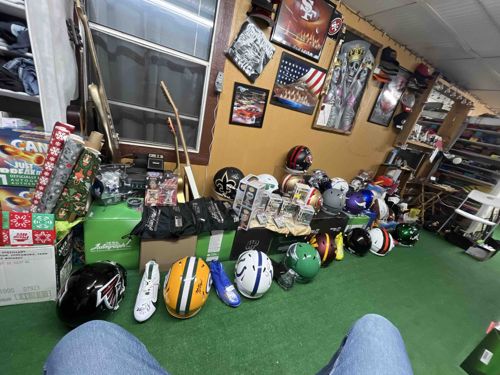 This is a diverse and extensive collection of National Football League (NFL) memorabilia, featuring a variety of collectibles displayed within an interior setting. The primary items consist of numerous full-sized and miniature football helmets representing various teams including the Atlanta Falcons, Green Bay Packers, New Orleans Saints, Indianapolis Colts, and New York Jets, among others. Notable items include multiple helmets that appear to be autographed, such as the yellow Packers helmet and the white Colts helmet. The collection also includes several pairs of football cleats, boxed Funko Pop! figures, and framed sports-themed wall art, including San Francisco 49ers imagery and an American flag motif. The items are shown in a room with green carpet, with some items placed on the floor and others on shelving or wall-mounted. The condition visually ranges from seemingly pristine autographed pieces to items showing minor display wear. Construction involves standard commercial sports merchandise materials such as molded polycarbonate for helmets and synthetic fabrics for footwear. Many pieces appear to be contemporary or from the last two decades, reflecting modern team logos and merchandise styles. The craftsmanship reflects official league-licensed manufacturing standards, often featuring team decals and high-gloss finishes typical of authentic display gear.