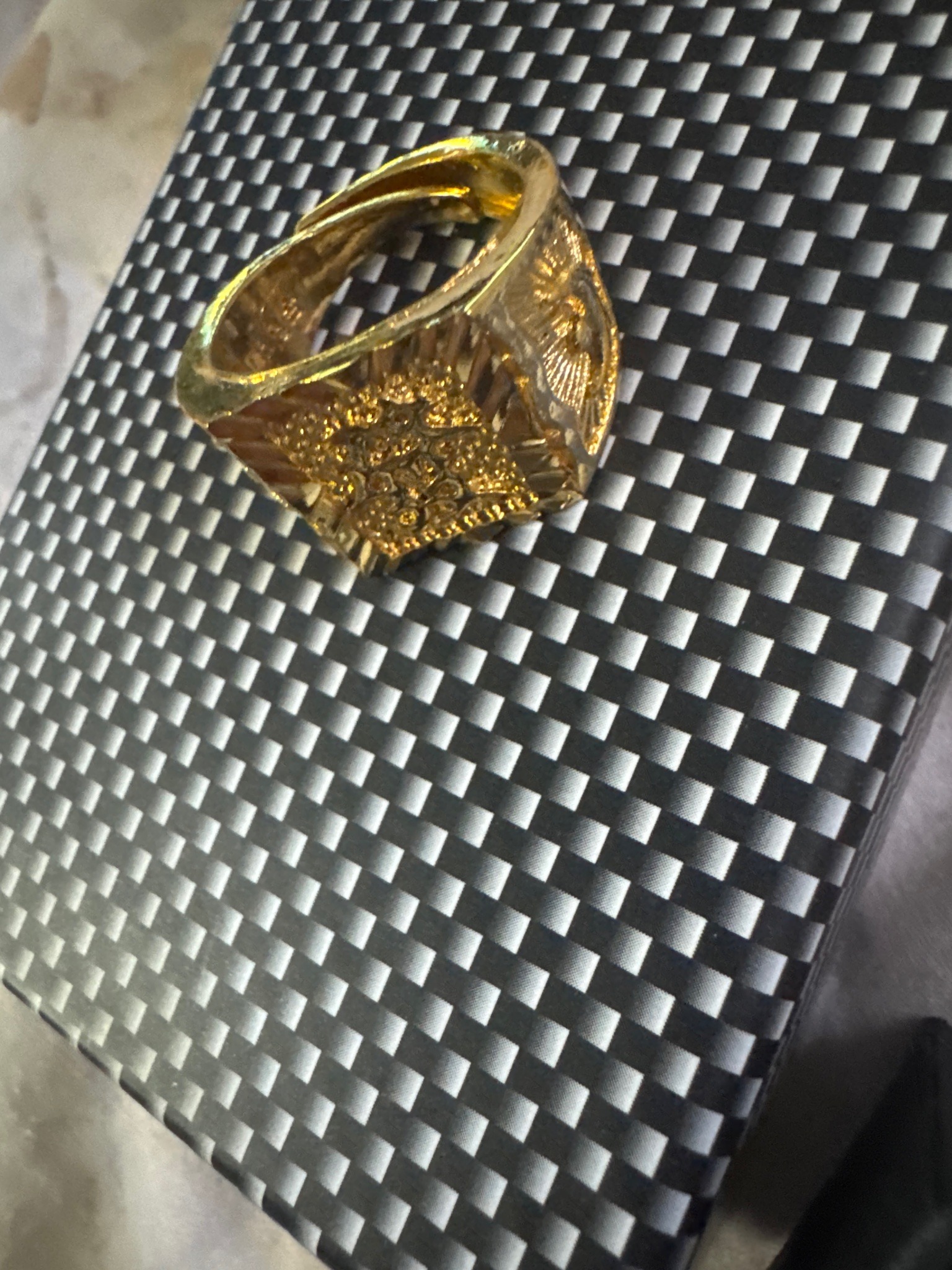This is a substantial men's signet-style ring featuring a bold, yellow gold-tone finish. The ring is constructed with a large, square-shaped face displaying intricate relief detailing with a textured, nugget-like or crystalline pattern in the center. The shoulders of the ring are highly decorated; one side clearly displays an eagle motif with outstretched wings, suggesting a patriotic or 'Mexican Eagle' style common in certain regional jewelry designs. The ring appears to be made of a base metal with a heavy gold plating or 'oro laminado,' as evidenced by the high-shine reflective surface and the visible adjustable sizing gap at the bottom of the shank. This bypass-style adjustable band is a common feature in fashion or costume jewelry rather than high-end solid gold pieces. The overall aesthetic is maximalist and ornate, reminiscent of late 20th-century to contemporary urban fashion. Regarding condition, the piece shows significant surface wear, with visible scratches, slight dulling of the finish in recessed areas, and some potential wear-through of the plating on the inner band. The craftsmanship involves cast metal with machine-stamped detailing on the sides. No explicit hallmark or maker's mark is visible in the photograph, but the interior appears to have some indistinguishable embossed lettering or numbering.