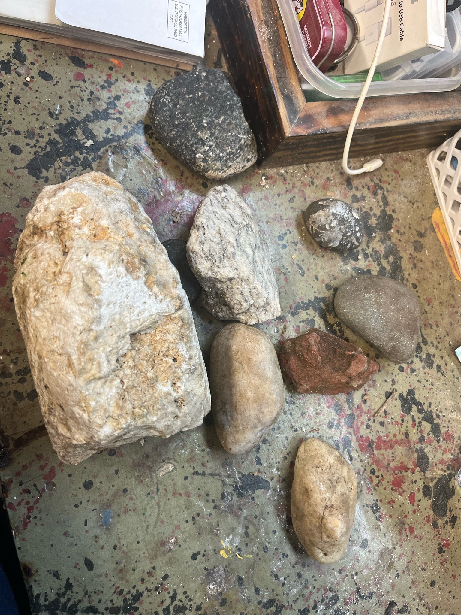 This is a diverse assembly of eight individual mineral and rock specimens, varying significantly in geological composition, size, and texture. The largest specimen is a light-colored, angular sedimentary or metamorphic rock, roughly 6-8 inches in length, exhibiting a tan-to-cream palette with visible pitting, surface crystallization, and iron-staining oxodization. The collection also includes several water-worn river stones; one is a smooth, tan oblong pebble, while another is a flat, grey, rounded stone showing glacial or fluvial weathering. A distinctive dark grey specimen at the top displays a grainy igneous texture, potentially basalt or gabbro, with a speckled crystalline surface. A smaller, reddish-brown stone appears to be hematite-rich or clay-based with a jagged, irregular fracture pattern. One small specimen features interesting white inclusions or possible small fossilized imprints on a dark matrix. The condition across the set is natural and unpolished, showing raw geological features such as surface dust, minor fractures, and varied levels of lithic weathering. There are no signs of lapidary work or artificial shaping. The items are shown on a splattered industrial workbench, suggesting they are field-collected specimens rather than retail-prepared decorative stones.