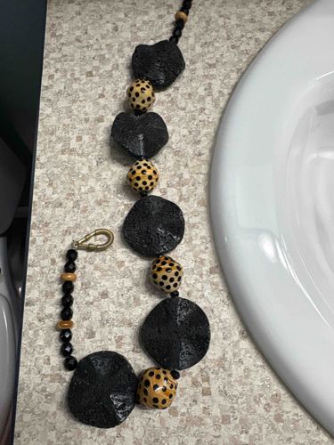 This is a substantial statement necklace featuring a bold, artisanal design utilizing mixed-media materials. The necklace is composed of large, irregularly shaped, matte black discs that appear to be made of either lava rock (basalt) or a textured resin/polymer, measuring approximately 4-5cm in diameter. These discs have a porous, cratered surface texture that contrasts sharply with the smooth, spherical cream-colored beads decorated with dark brown leopard-like spots. Smaller black faceted spacer beads and natural wooden disc accents are interspersed throughout the strand. The construction utilizes a heavy-duty stringing material or wire, terminating in a large, vintage-style brass hook or lobster-claw clasp that shows signs of tarnish and a gold-toned patina. The overall style suggests a contemporary ethnic or 'global chic' aesthetic, likely dating from the 1990s to the early 2000s. The piece exhibits high-quality organic craftsmanship with no visible cracks or missing elements, though some surface dust is present in the pits of the black discs. The asymmetry and scale of the elements indicate it is a handcrafted boutique item rather than a mass-produced piece.