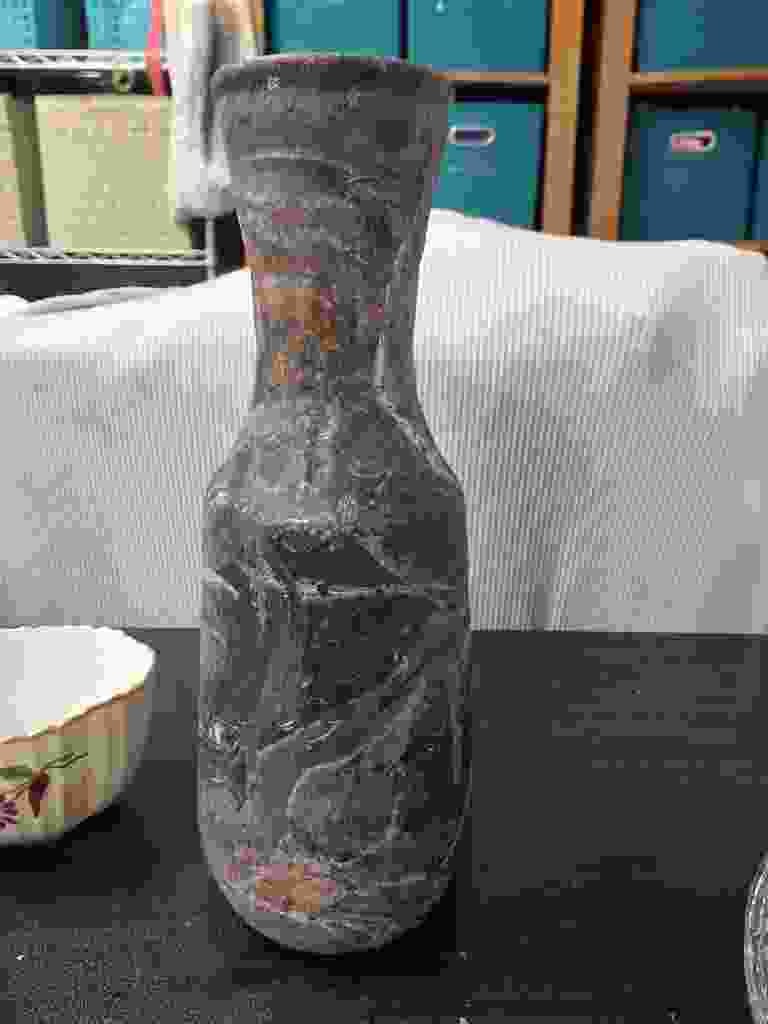 This item is a tall, narrow ceramic bud vase featuring a tapered neck and a slightly flared rim. The exterior is characterized by a heavy, matte-textured charcoal or slate gray glaze with an uneven, slab-built or hand-thrown appearance. Notably, the vase is decorated with relief-style floral motifs, including pink and yellow blossoms that suggest a traditional Japanese aesthetic, possibly mimicking champlevé or cloisonné techniques in ceramic form. The construction shows organic, faceted lines along the body, giving it a wabi-sabi or artisanal quality. While the image does not permit a view of the base (where maker's marks or kiln stamps are typically located), the style is consistent with 20th-century Studio Pottery or exported Japanese ceramics. The condition appears fair to good; there is some visible surface dust and potential minor abrasions to the raised floral elements, though no major structural chips or cracks are immediately evident in this view. The color palette is somber, with the dark body providing a high-contrast background for the sparse, colorful botanical accents.