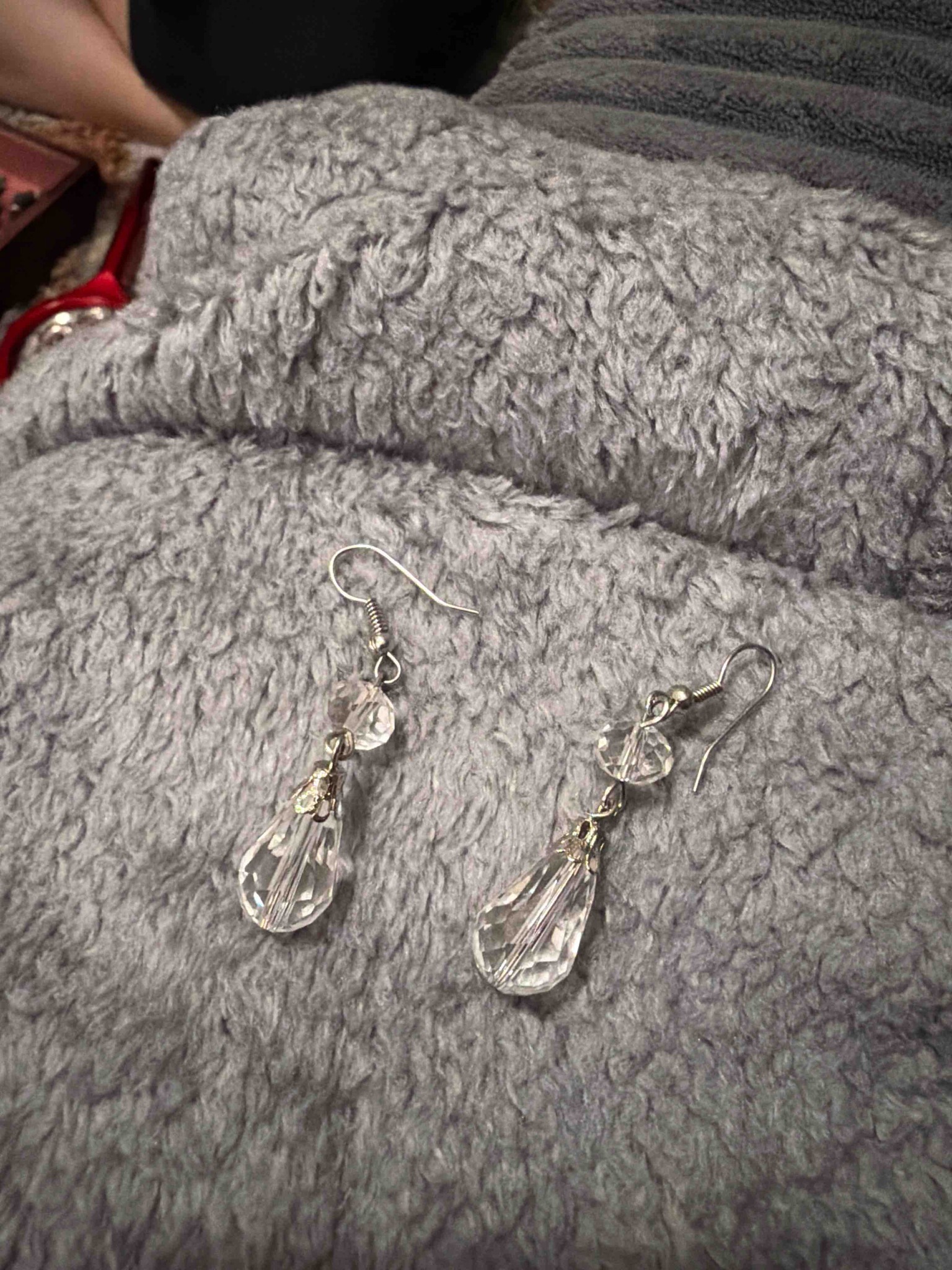 A pair of decorative dangle earrings featuring clear, faceted components resembling crystal or high-grade glass. Each earring consists of a silver-toned metal fishhook wire (shepherd's hook) with a standard decorative coil and bead at the base. Suspended from the hook is a two-tiered drop arrangement. The upper section features a small, round faceted bead, which is linked via a metal eye pin to a larger, elongated teardrop-shaped pendant. The teardrop pendant is capped with a silver-colored decorative filigree-style metal bead cap, adding a touch of vintage-inspired elegance. The teardrop drops exhibit vertical faceting, designed to catch and refract light. Based on the construction and findings, these appear to be contemporary fashion jewelry, possibly handmade or assembled using mass-produced components. There are no visible hallmarks or maker's marks indicating precious metal content (like .925 sterling silver), suggesting a base metal with silver plating. The condition appears fair to good, though some minor tarnishing is visible on the metal wire loops and the bead caps, consistent with light wear or oxidation of silver-plated materials. The facets on the clear drops appear sharp without significant visible chips or scratches.