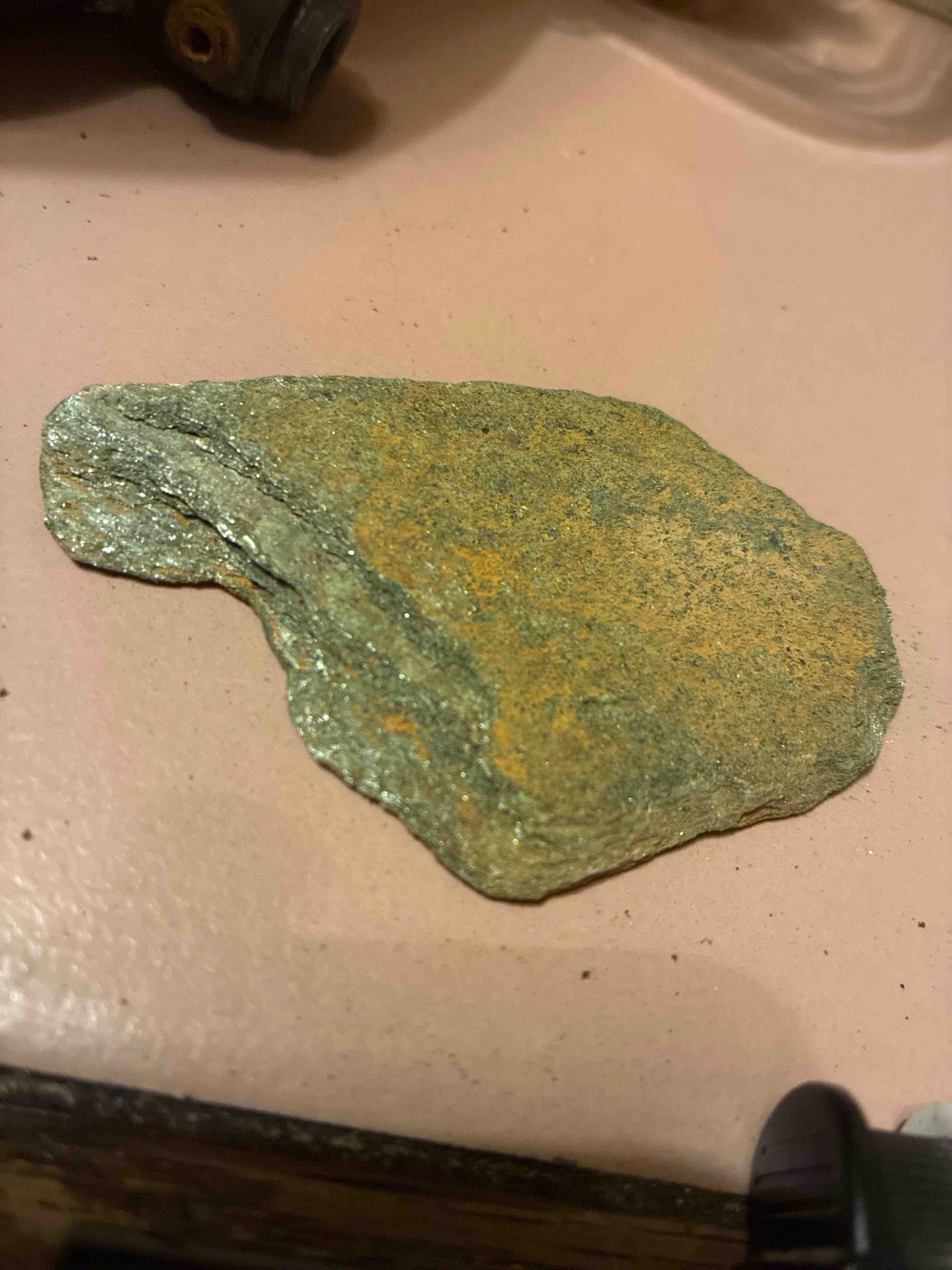 This item is a medium-grained metamorphic rock specimen, specifically identified as mica schist. The piece measures approximately 4-5 inches in length with a flattened, tabular geometry characteristic of regional metamorphism. The primary physical characteristic is its strong foliation, or 'schistosity,' which is visible as distinct layering and parallel alignment of mineral grains. The color palette across the surface is a complex mix of silvery-gray, dull green, and significant yellowish-ochre iron oxide staining, indicating prolonged exposure to moisture and weathering. The silvery sheen is caused by a high concentration of muscovite or biotite mica flakes, which align to create a glittering effect when the piece is rotated in the light. The construction is entirely natural, formed deep within the Earth's crust under intense heat and pressure, likely dating back millions of years. Notable features include the uneven, jagged edges on the left side where the rock has cleaved along its natural planes of weakness. There are no man-made markings, signatures, or stamps, as this is a raw natural specimen. The condition is raw and weathered; the surface is rough to the touch with visible pitting and sedimentary-like deposits of oxidation. Its craftsmanship is provided by nature, showcasing the high-quality crystallization of silicate minerals characteristic of high-grade metamorphic environments.