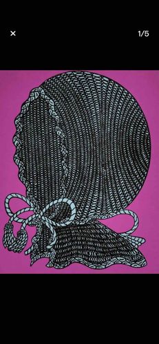 This is a significant limited-edition screenprint titled 'Baby Bonnet' created in 1978 by the American artist William Nelson Copley, also known as CPLY. The artwork measures approximately 84 cm by 66.5 cm and displays a bold, Pop-Art meets Surrealism aesthetic. The composition features a central, intricately patterned baby bonnet rendered in black ink against a vibrant, saturated fuchsia or magenta background. The bonnet's texture is depicted through a complex series of rhythmic, lace-like line work that suggests knit or crochet patterns. It includes detailed drawstrings with tassels tied in a decorative bow at the chin. This specific piece is a rare hand-signed edition, numbered 2 out of a limited run of 200 (2/200). The print is in excellent condition with no visible foxing, tears, or significant fading, maintaining sharp contrasts between the heavy black ink and the neon-pink field. Created during the late 20th century in the USA, it exemplifies Copley's signature style of isolating mundane objects to explore themes of irony and eroticism. The high-quality silkscreen application ensures uniform color distribution and crisp edges. It is a prime example of American Post-War art, offered through Galerie Rotor.