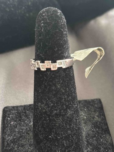 This contemporary jewelry piece is a 0.25 carat total weight diamond band, crafted in a high-polish silver-toned metal, likely 10k or 14k white gold based on its luster and professional setting. The ring features a distinctive alternating geometric or 'brick' pattern, where small round-cut diamonds are bezel-set into square frames. These frames occupy different vertical positions along the crown of the ring, creating a staggered, architectural aesthetic. The total diamond weight is reported as 0.25 carats, suggesting several small stones of consistent clarity and color grade. The band transitions into a solid, smooth shank at the rear to ensure comfort for the wearer. The craftsmanship is modern, with clean lines and secure bezel settings that protect the girdle of each stone. The condition appears to be excellent with no visible missing stones, though there is a retailers tag attached to the side, indicating it may be new or recently prepared for resale. The style is reflective of 21st-century minimalist fashion, suitable for use as a wedding band, stackable ring, or fashion piece. While specific maker's marks are not visible in this orientation, the precise geometry suggests machine-assisted casting and finishing common in high-quality commercial jewelry manufacturing.