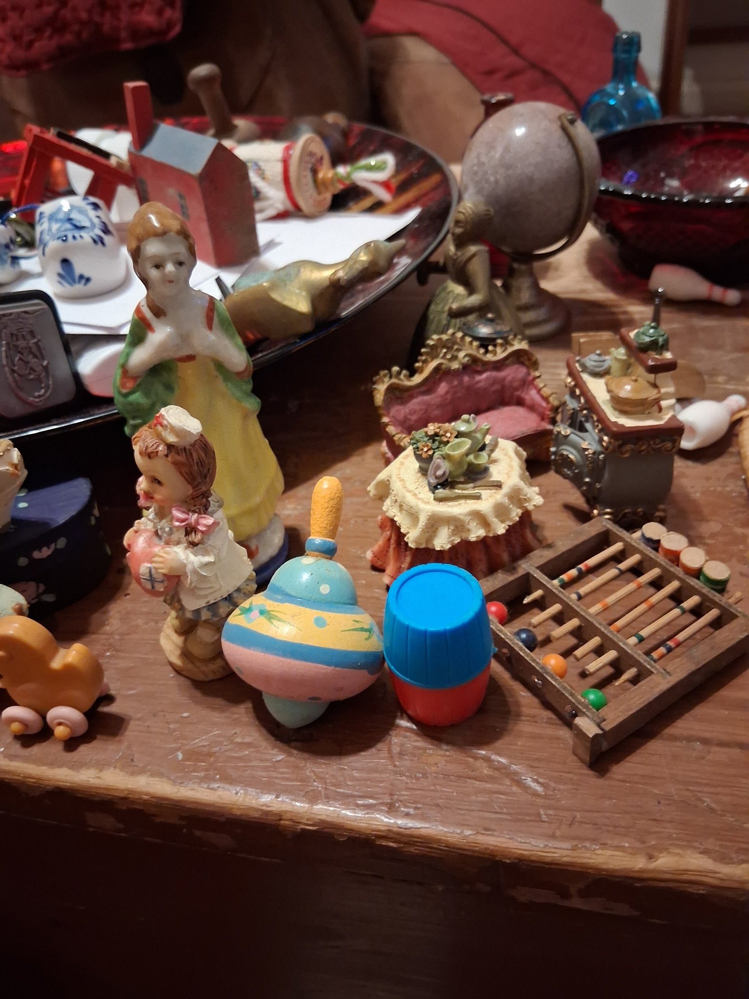 This diverse assembly of miniatures reflects a collection of mid-to-late 20th-century decorative curios and toy elements. The centerpiece is a porcelain bisque figurine of a woman in a yellow dress with a green shawl, standing approximately 4-5 inches tall with hand-painted facial features. Beside her is a smaller polyresin figurine of a girl in a nurse-like cap holding a heart. The arrangement includes dollhouse-scale furniture: a Rococo-style settee with pink velvet upholstery and a gilded resin frame, accompanied by a fringed pedestal table topped with miniature ceramics. A small-scale abacus crafted from wood and wire with colored beads shows fine artisanal work. Notable toys include a brightly painted wooden spinning top with pastel stripes and a small orange wooden pull-toy duck with pink wheels. Further background items include a miniature terrestrial globe on a metal stand, a cobalt blue glass bottle, and a miniature vintage-style cooking stove. Condition across the items is generally good, showing moderate surface dust and minor paint wear consistent with display. Materials range from bisque porcelain and resin to wood, glass, and metal, indicating a 'found object' collection of disparate manufacturing origins, many likely being souvenir or hobbyist miniatures from the 1960s through the 1980s.