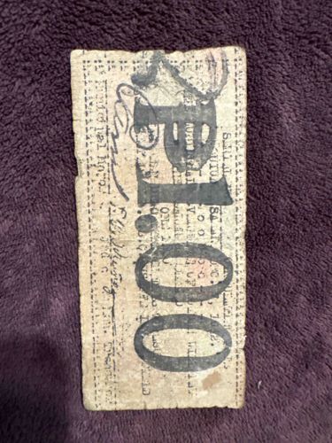 This item is an example of local emergency paper currency, likely issued during the Spanish Civil War era (circa 1937) by the Consell Municipal d'Olot. The note is rectangular, printed on a coarse, off-white or yellowish paper stock that shows significant signs of age and handling. The most prominent feature is a large, black overprint of the numeral '100' positioned vertically across the face. Behind this overprint, fine typography is visible, representing the original municipal bond or note text, which includes Catalan script. The left edge appears roughly cut or perforated, suggesting it was part of a larger sheet or booklet. The condition is heavily circulated, characterized by rounded corners, frayed edges with small nicks, and significant staining or foxing throughout the paper's surface. A dark, circular smudge or stamp is visible near the center. The reverse side is not shown, but typically such notes might feature signatures or secondary stamps to validate their authenticity during a period of extreme economic instability. The craftsmanship reflects the functional, hurried production of wartime necessity rather than high-security banknote printing, with simple black ink on basic paper.