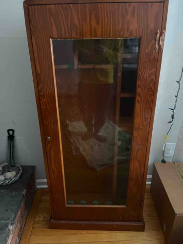This is a freestanding wooden gun cabinet, likely constructed from pine or a similar coniferous wood, featuring a prominent vertical grain pattern and a warm medium-brown honey finish. The piece stands approximately five to six feet tall with a rectangular profile and a slightly wider plinth base. Its primary feature is a large inset glass viewing pane on the front door, secured with decorative hammered copper or brass butterfly hinges on the right side. The interior shows felt-lined barrel notches, suggesting it is designed to hold approximately 5-6 long guns. The construction utilizes flat-panel joinery typical of mid-to-late 20th-century mass-produced furniture, specifically from the 1960s to the 1980s. Condition-wise, the cabinet shows light surface wear, minor scuffs along the base trim, and some dust accumulation on the glass. The finish appears original with a slight aged patina, and there is a circular keyhole hardware visible on the left, though no key is currently shown. The craftsmanship is functional rather than highly ornamental, emphasizing utility and displaying collectibles safely behind a locked glass barrier.