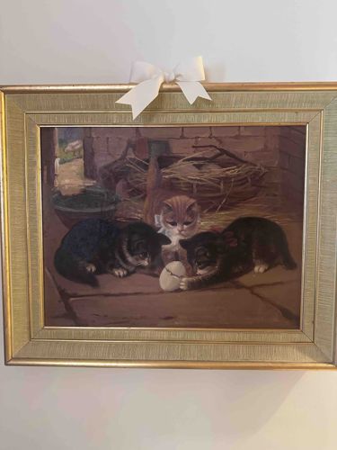 Three Kittens Playing with an Egg (Oil on Board)