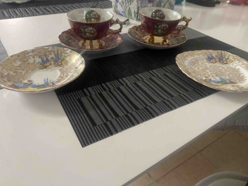 This is a sophisticated tea service set comprising two cups, two saucers, and two additional side plates, appearing to be crafted from high-quality bone china rather than glass, dating approximately to the mid-19th century (circa 1850). The cups feature a striking deep crimson or garnet-toned ground, accented by ornate gilded scrollwork and central vignettes depicting classical or pastoral scenes in polychrome enamels. The interior of the cups is finished in a clean white glaze, decorated with further interior floral or figural cartouches. The handles are elaborately molded with floral or acanthus leaf motifs and finished in heavy gilding. The accompanying saucers and side plates display extensive gold-washed or 'clobbered' decoration with scalloped edges and intricate floral border patterns. The condition appears to be fair to good for its age, showing visible wear to the gilding on the high points of the handles and rims, characteristic of long-term domestic use. The craftsmanship reflects the high-style Victorian era, likely originating from a prestigious English factory such as Minton, Coalport, or perhaps a continental maker like Sèvres, given the rich ground color and gilding style.