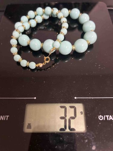 This is an 18-inch long vintage necklace, weighing 32 grams, featuring graduated beads of a soft, light blue hue. The beads are smooth and spherical, made of what appears to be glass, ceramic, or a synthetic material, possibly simulating chalcedony or robin's egg blue jade. Their color is uniform and opaque. The smallest beads, measuring approximately 1/4 inch in diameter, are positioned near the clasp, gradually increasing in size with the largest bead, about 1/2 inch in diameter, centrally located. Between each larger light blue bead are two smaller, flat, gold-tone spacer beads, adding a metallic accent and creating a symmetrical rhythm. The necklace is strung on a white string, visible particularly at the clasp area, indicating a traditional stringing method. The clasp itself is a functional, gold-tone spring ring clasp, which appears to be in good working order. There are no readily apparent manufacturing marks or signatures visible from the image. The overall condition appears good, with no obvious chips, cracks, or significant wear on the beads. The gold-tone spacers and clasp show minimal signs of tarnish, consistent with a vintage item that has been well-maintained or with limited use. The design suggests a classic style, likely dating from the mid-20th century, epitomizing a timeless aesthetic that would complement various attire. The craftsmanship indicates a carefully assembled piece, with the graduation of beads displaying an intentional design choice.