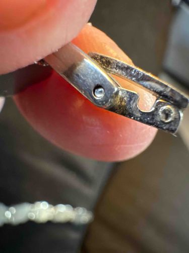 This item is a metallic jewelry component, specifically a box clasp with an integrated hinged safety latch. The clasp is constructed from a silver-toned metal, likely sterling silver or a base metal such as brass plated with nickel or rhodium. It features a rectangular housing with a distinctive U-shaped notch designed to receive a corresponding tongue piece (not fully visible). A critical security feature is the secondary hinged safety bar that flips over the main box to prevent accidental opening. The craftsmanship shows mechanical assembly with visible pins or rivets holding the hinged components in place. Regarding condition, there is significant surface tarnish, oxidation, and possible plate loss, particularly visible as dark, mottled patches on the interior and edges of the safety latch. Fine surface scratches and general wear are present, indicating a period of use. Based on the mechanical design and construction style, this component is consistent with late 20th-century mass-produced jewelry, likely from the 1970s to the 1990s. The presence of some debris indicates it has not been recently cleaned. This type of clasp is typically found on bracelets or necklaces where a flush, secure closure is required.