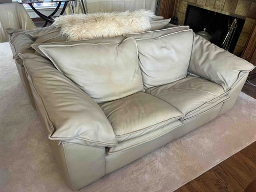 This is a two-seat loveseat sofa designed by Vico Magistretti for Cassina, identifiable by its iconic 'Maralunga' silhouette. The piece is upholstered in a light taupe or 'greige' leather and features the signature 'flip-up' backrests that can be folded down for low-back support or extended for headrest functionality. The construction is characterized by soft, voluminous cushions with piped edge detailing and wide, padded armrests that flow seamlessly into the base. The design, originating in the early 1970s, represents a hallmark of Italian Modernism, combining structural innovation with high-end luxury materials. Regarding condition, the leather shows visible signs of age and use, including moderate sagging in the seat and back cushions, suggesting a loss of interior foam resiliency over time. There is noticeable surface discoloration, particularly on the left-hand seat and backrest cushions, which appear to have darker, yellowed patches likely caused by body oils, sunlight exposure, or general wear. The piping remains intact, though the leather exhibits a softened patina and minor creasing throughout. No visible maker's marks are shown in the photo, but the specific hidden bicycle-chain mechanism for the backrests and the overall tailoring are consistent with authentic Cassina manufacturing from the late 20th century.