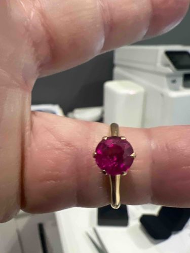This is a classic solitaire ring featuring a round-cut, vivid purplish-red gemstone, identifying as a ruby or high-quality synthetic corundum, weighing approximately 1.00 carat. The center stone is held in place by a six-prong setting, which offers security and maximizes light exposure for the stone's brilliance. The band is crafted from 14k yellow gold and is sized at 8 3/4. The mounting features a tapered shank that narrows slightly as it approaches the head of the ring, a design characteristic typical of late 20th-century jewelry. The gemstone exhibits a deep saturation with a 'pigeon blood' hue, displaying significant internal reflections. Upon close inspection, the gold shows minor surface abrasions and a slight patina consistent with light wear, but no structural damage or thinning of the shank is visible. The prongs appear to be in good condition, firmly grasping the crown of the gemstone. While no specific maker's mark is visible in the provided image, the 14k hallmark is noted by the owner. The overall craftsmanship suggests a high-quality commercial piece from the 1980s or 1990s, offering a timeless aesthetic through its simple yet elegant construction.