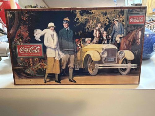 This rectangular wooden wall plaque or sign features a reproduction of a classic 1920s-era Coca-Cola advertisement. The central imagery depicts an affluent, well-dressed group of people socializing around a vintage cream-colored convertible and an equestrian figure on horseback, set against an autumnal forest backdrop. The figures are dressed in period-accurate 1920s fashion, including cloche hats, fur wraps, and knit sweaters. Two distinct Coca-Cola logos are visible: a prominent green-bordered red rectangle on the left side with the slogan "Drink Coca-Cola, Delicious and Refreshing," and a smaller red logo on the upper right. The item appears to be made of compressed wood or plywood with a printed paper or lithographic overlay, finished with a decorative dark wood grain border. Physically, the sign shows signs of wear consistent with age or simulated aging, including minor chipping along the upper edge and light surface abrasions. The color palette is dominated by earth tones—deep greens, ochre yellows, and siennas—typical of the Jazz Age illustrative style. This piece represents a late 20th-century reproduction of early 20th-century advertising art, commonly produced as home decor or for themed establishments to evoke a sense of Americana nostalgia. The craftsmanship is standard for mass-produced decorative items, utilizing a flat surface with a gloss finish to protect the graphic art.