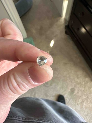 This item is a single solitaire stud earring featuring a prominently set clear, faceted gemstone. The gemstone appears to be a round brilliant cut, though the image clarity suggests significant internal inclusions or surface grime, giving it a somewhat cloudy or 'salt and pepper' appearance. It is held in place by a white metal setting, likely sterling silver, white gold, or platinum, featuring a three or four-prong basket mounting that allows light to enter the stone from the sides. The size of the stone is approximately 5mm to 6mm in diameter, suggesting a weight of roughly 0.50 to 0.75 carats if it were a diamond. Regarding condition, the metal shows slight dulling consistent with surface oxidation or light wear, and the stone requires professional cleaning to determine its true clarity grade. No visible hallmarks are discernable in the provided view, but the overall construction uses a standard friction-post design common in contemporary jewelry from the late 20th to early 21st century. The craftsmanship is functional and minimalist, typical of commercial-grade fine or semi-fine jewelry intended for daily wear.