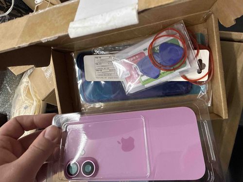 This is a comprehensive DIY backend glass replacement kit for an Apple iPhone, likely for an iPhone 11 or 12 model given the dual-lens camera cutout. The primary component is a vibrant purple rear glass panel featuring the central Apple logo and accurate cutouts for the camera assembly and flash. The panel is housed in a clear protective plastic tray. Included within the cardboard shipping box is a full suite of repair tools: blue plastic prying picks, red rubber bands for securing the panel during adhesive curing, cleaning wipes (marked 'Wet' and 'Dry'), and ultra-fine precision tweezers (labeled with models TS-12, TS-11, TS-13, and TS-15). The components appear new and unused, specifically designed for technical refurbishing. Quality indicators include the high-gloss finish of the glass and the organized packaging of the small tools. The kit represents modern 21st-century consumer electronics repair culture, allowing for the restoration of aesthetically damaged smartphones using third-party replacement parts that mimic original equipment manufacturer specifications.