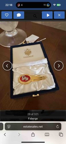 This is a luxury desk accessory presented in its original navy blue velvet presentation box, which features a cream silk lining stamped with the Fabergé name and the Imperial Russian double-headed eagle crest. The item is a gilded metal bookmark or page clip featuring an oval-shaped medallion at its head. The medallion is finished with translucent red guilloché enamel over a patterned ground, surrounded by a delicate gold-toned rope-twist border. At the center of the red enamel is a small, clear gemstone-encrusted silver-toned motif, possibly a stylized crown or heraldic symbol. The metal clip portion exhibits a high-polish gold finish. The craftsmanship reflects the late 20th-century licensed Fabergé style, often produced by workmasters like Victor Mayer. The piece appears to be in excellent condition with no visible chips to the enamel, though minor surface scratches on the clip portion are expected for an item of this age. The overall presentation indicates a high level of detail consistent with modern luxury reproductions of historical Imperial Russian designs.