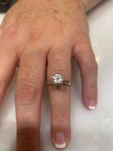 This is a classic solitaire engagement ring featuring a single round brilliant-cut diamond as the central focal point. The diamond is estimated to be approximately 1.00 to 1.50 carats based on its visual diameter relative to the finger. It is secured by a distinctive six-prong setting, often referred to as a 'Tiffany-style' mount, which maximizes light entry and enhances brilliance. The mounting is crafted from a high-lustre white metal, likely 14k or 18k white gold or platinum, showing a smooth, polished finish. The band features a slightly tapered 'knife-edge' or rounded shank design that narrows as it approaches the center stone, focusing all visual attention on the gemstone. The diamond exhibits a high level of brilliance and fire, suggesting a good-to-excellent cut grade, though specific color and clarity would require a loupe for definitive grading. In terms of condition, the metal shows minor surface abrasions and superficial scratching consistent with regular daily wear and the passage of time. There are no immediate signs of structural failure, such as warped metal or loose prongs visible at this distance. The overall style is timeless, likely dating from the mid-20th century to the modern day, representing a standard of high-quality fine jewelry craftsmanship.