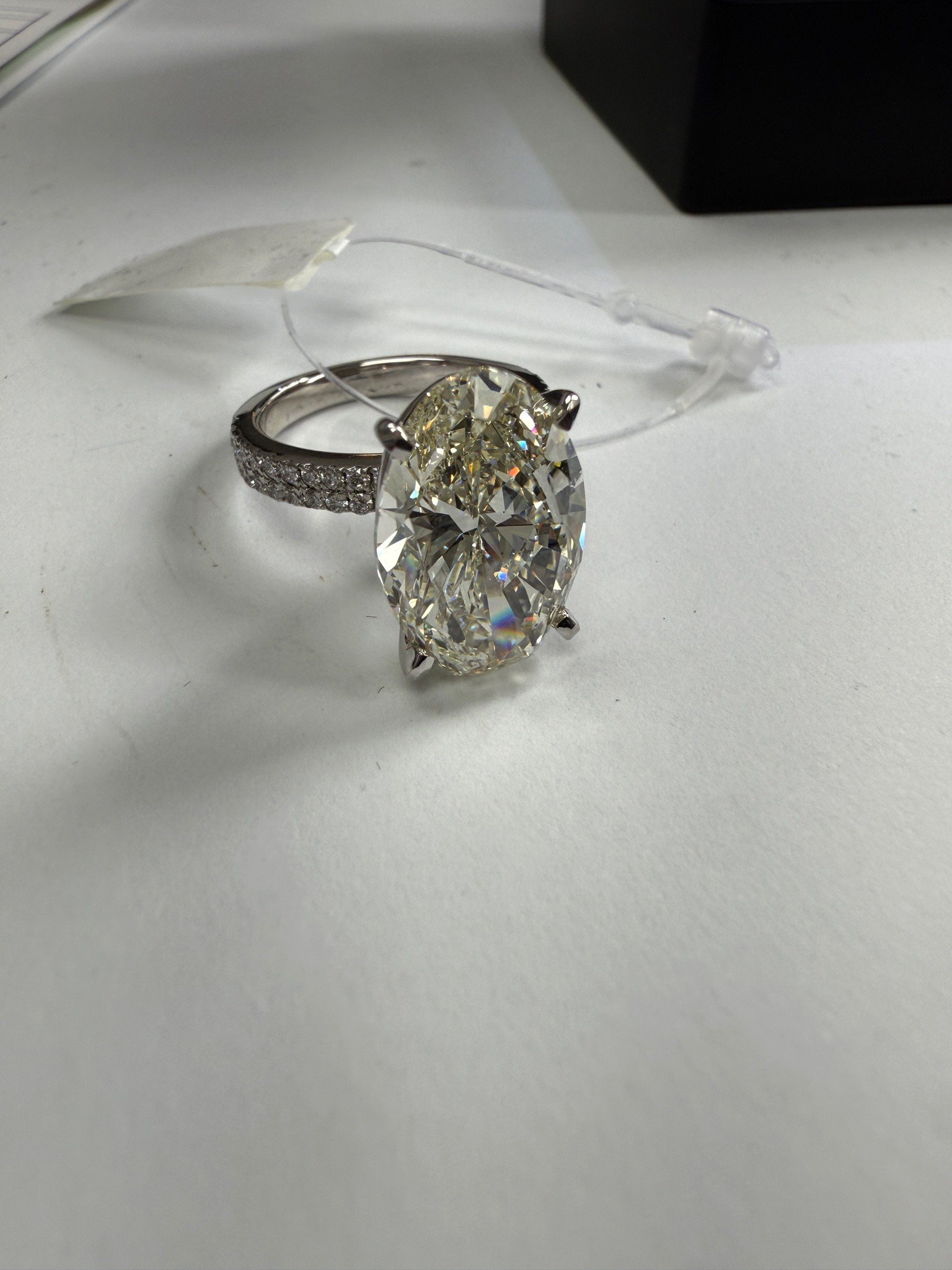 This high-jewelry piece features a substantial oval brilliant-cut diamond as its primary focal point. The center stone is securely set in a four-prong mounting crafted from a white metal, likely platinum or 18k white gold, given its bright, reflective luster. The diamond exhibits a high degree of fire and scintillation with a visible 'bow-tie' effect characteristic of the oval cut. Supporting the center stone is a modern pavé-set shank, where two rows of small round brilliant diamonds are densely set into the band, extending approximately halfway around the circumference. The craftsmanship appears to be contemporary and of high quality, with precise prong work and uniform stone setting. The band's inner surface shows a smooth, high-polish finish. There are no visible signs of wear, surface scratches, or metal fatigue, suggesting the piece is in excellent, possibly new condition. A white inventory string tag is attached to the shank, indicating it is likely an active retail or auction item. The overall style is a classic modern solitaire with added brilliance on the mounting.