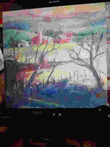 This is a 20th-century oil painting on canvas depicting a rural farmstead. The composition features a prominent group of red outbuildings, likely a barn and silo, situated in the mid-ground. The foreground is dominated by two large, leafless deciduous trees with dark, spindly branches that frame the scene. The landscape utilizes a varied palette of earthy greens and yellows in the fields, contrasting with deep blues in the lower foreground shadows and a soft, hazy pink and orange sky. The brushwork appears expressive and somewhat impressionistic, suggesting an mid-to-late 20th-century execution. While no signature is immediately visible due to image quality, the style reflects the American regionalist tradition. The canvas shows a flat application of paint with no significant impasto visible. The condition appears stable, though pixelation in the capture obscures fine surface details or potential crazing. There are no signs of major structural damage like tears or warping, but an appraisal would require a physical inspection of the canvas reverse and stretcher bars for specific maker stamps or provenance notes.