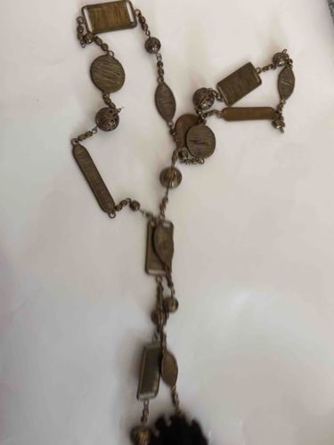 Vintage Brass Geometric Panel and Filigree Bead Sautoir Necklace