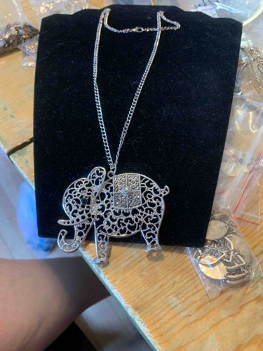 This item is a large, statement-style pendant necklace featuring an elephant motif, displayed on a black velvet bust. The pendant is crafted with an intricate openwork filigree design across the body and head of the elephant, finished in a bright silver-toned metal, likely sterling silver or a high-quality silver plate. The elephant's ear and a decorative rectangular saddle (howdah) on its back are pavé-set with numerous small, glittering marcasite stones, which provide a dark, metallic luster characteristic of vintage-inspired jewelry. A single dark stone, possibly an onyx or dark glass bead, serves as the eye. The elephant is depicted in profile with its trunk raised, a symbol often associated with good luck. The piece is suspended from a simple silver-toned curb link chain with a lobster claw or spring ring clasp. The craftsmanship shows attention to detail in the delicate scrolling of the filigree and the precise setting of the marcasite. While the specific maker's mark is not visible in the photo, the style is reminiscent of Art Deco revival or Victorian-style marcasite jewelry popular in the late 20th century. The condition appears excellent with no visible missing stones or tarnishing, suggesting a well-maintained or modern piece.