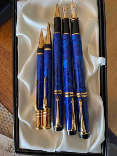 This is a premium five-piece writing instrument set from the Parker Duofold collection, featuring a striking marbled 'Lapis Lazuli Blue' finish. The set includes a Centennial fountain pen, an International fountain pen, a rollerball pen, a ballpoint pen, and a mechanical pencil. Each instrument is constructed from high-grade cast acrylic resin with a deep blue and black swirling pattern, complemented by heavy 23k gold-plated trim. Notable features include the iconic Parker arrow clips and dual gold bands at the base of the caps. The fountain pens are equipped with dual-tone 18k gold nibs, intricately engraved with the Parker logo and '750' gold purity hallmark. The craftsmanship represents the late 20th-century revival of the classic Duofold line, specifically the MKII design era from the mid-1990s. The set appears in excellent condition, housed in a white satin-lined presentation box. There is no visible evidence of resin cracking or significant plating loss to the gold furniture. The nibs appear straight and well-maintained. This collection is a quintessential example of high-quality modern luxury stationery, valued for its durability and timeless Art Deco-inspired aesthetic.