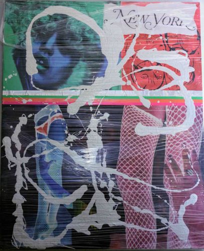 This rectangular mixed-media work is a vertical composition that utilizes a four-quadrant grid structure, suggesting a contemporary or neo-pop aesthetic. The background consists of vibrant, high-contrast imagery: the upper-left quadrant features a blue-toned face reminiscent of classical sculpture; the upper-right includes the text 'NEW YORK' in a stylized font against a red background; and the lower quadrants depict figures in fishnet stockings with cyan and magenta hued lighting. A horizontal rainbow-striped band divides the upper and lower halves. The most prominent feature is a thick, gestural impasto overlay of silver or metallic white paint applied in a chaotic, drip-style splatter reminiscent of Action Painting. The artwork is currently encased in a tight, protective plastic shrink-wrap, which creates horizontal glares and distortions, making it difficult to assess the exact surface texture of the underlying substrate—likely canvas or a rigid panel. No artist signature or maker's marks are clearly visible on the face of the work. The style suggests a late 20th to early 21st-century production, drawing heavily from street art and commercial collage influences. The condition appears stable under the wrap, though the plastic itself shows some minor surface scuffs and tension warping at the corners.