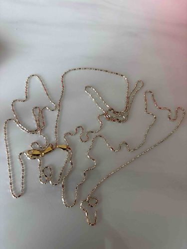 This item is a decorative neck chain featuring a two-tone metallic construction. The chain is composed of alternating cylindrical bar links and small circular connectors, often referred to as a ‘bar and link’ or ‘station’ style chain. The majority of the chain appears to be crafted from white gold or silver-toned metal, featuring a diamond-cut finish that creates high-reflectivity facets designed to catch the light. In contrast, the lobster claw clasp assembly and the end caps are rendered in a warm yellow gold finish, suggesting a mixed-metal aesthetic. The chain is of a fine gauge, indicating a delicate style likely intended for layering or holding a light pendant. Regarding its condition, the chain appears tangled in the image but shows no obvious kinks or broken links; the polish remains bright without significant visible tarnish, though microscopic surface scratches are expected given the material. The craftsmanship suggests a modern piece, likely late 20th to early 21st century. While specific hallmarks are not visible due to the resolution, they would typically be found on the flat tab near the clasp or the clasp itself to indicate metal purity (such as 14K or 18K). The overall quality appears consistent with fine jewelry manufacturing standards.