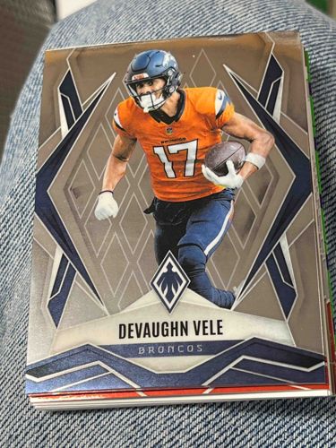 This is a modern American football trading card featuring wide receiver Devaughn Vele of the Denver Broncos. The card is from the Panini Phoenix set, characterized by its distinctive geometric background designs including diamond and chevron patterns in various shades of blue, tan, and silver. The player is depicted in mid-action, wearing a bright orange Broncos jersey with the number 17, dark blue pants, and a navy helmet. His name 'DEVAUGHN VELE' and 'BRONCOS' team name are prominently displayed at the bottom of the card face. The card appears to be printed on a high-gloss, premium cardstock with a metallic or pearlescent finish typical of the Phoenix brand. It features sharp, crisp photography and bold graphic elements. Regarding condition, the card is shown in a raw state within a stack, with visible corners appearing relatively sharp at this angle, though microscopic whitening or 'softening' cannot be ruled out without closer inspection. There are no obvious surface scratches, creases, or water damage visible in the provided image. This card represents a 2024 rookie year issue, reflecting contemporary professional sports card manufacturing standards.