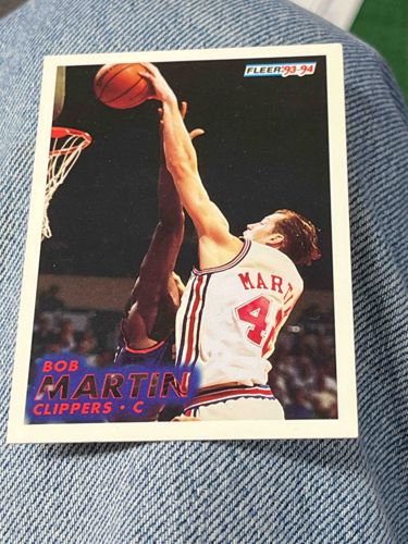 This is a standard 2.5 by 3.5 inch basketball trading card from the 1993-94 Fleer series, featuring center Bob Martin of the Los Angeles Clippers. The card is printed on white cardstock with a glossy finish on the front. The design features a full-bleed action photograph of Martin reaching for a layup or block near a basketball hoop, with the Fleer '93-94 logo located in the upper right corner. The player's name and position ('BOB MARTIN CLIPPERS - C') are displayed in the bottom left corner using a stylized blue and purple gradient typeface. The reverse side (not shown) would typically contain player statistics and biographical information. Regarding condition, the card shows minor signs of handling. There appears to be slight whitening or 'chipping' on the bottom edge and corners, which is common for this era of card stock. The centering of the image within the white borders looks slightly shifted toward the bottom and left. There are no visible creases or heavy surface scratches in the provided image. This card represents a typical mass-produced sports collectible from the early 1990s 'junk wax' era, produced by the Fleer Corporation as part of their Series 2 release.