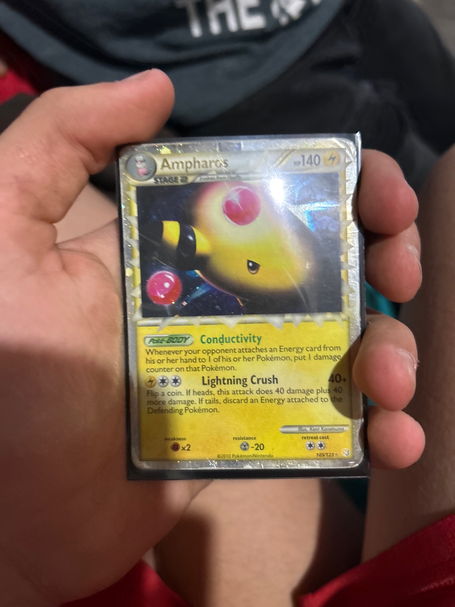 This is a rare 'Pokémon Prime' trading card featuring the character Ampharos, released as part of the HeartGold & SoulSilver expansion set in 2010. The card is distinguished by the iconic HGSS Prime design, which includes a close-up, high-detail 3D render of the character’s face that appears to break through the inner frame, and a characteristic jagged, holographic border that encircles the entire card face. The card is a Stage 2 Lightning-type with 140 HP. Its move set includes the Poké-BODY 'Conductivity' and the attack 'Lightning Crush.' The card is illustrated by Kent Kanetsuna and bears the collector number 105/123. Regarding the physical condition and material, the card possesses a metallic holographic finish on the borders and artwork. Based on the visual evidence, the card is currently housed in a black protective sleeve. There is significant visible wear, particularly a prominent crease or vertical scratch running through the top right section of the holographic artwork and border. The centering appears slightly heavy toward the bottom and left. The surface shows some micro-scratching through the sleeve, and the silver border displays some whitening or edge wear consistent with a played condition. These 'Prime' cards were the predecessors to the modern 'Ultra Rare' cards and are highly sought after by collectors of the late Nintendo/TPCi era.