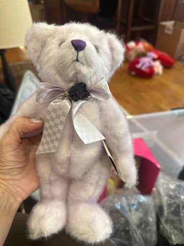 This is a vintage collectible plush teddy bear from Boyds Bears' 'The Head Bean Collection,' specifically identified as 'Pansy' from the Patty Duke signature line. The bear is approximately 8 to 10 inches tall and features a distinctive pale lavender or lilac-colored synthetic mohair-style fur. Its construction is characteristic of the high-quality Boyds investment pieces, including a fully jointed body (neck, arms, and legs) allowing for posability. Notable physical features include a hand-stitched purple fabric nose that coordinates with the fur, small black plastic safety eyes, and a decorative neck adornment consisting of a dual-textured silver and lavender checkered ribbon bow centered with a dark purple rosebud rosette. As a Patty Duke collaboration piece, the bear is expected to have 'Patty Duke' embroidered on the paw pad, which serves as a significant identifier and value marker. The condition appears to be excellent vintage state, with fluffy, clean fur and no visible matting, stains, or balding areas. The original 'The Head Bean Collection' hang tag is still attached to the left arm, suggesting it was kept as a collector's item rather than a toy. This style was popularized in the late 1990s through the early 2000s, reflecting the era's hobbyist bear-collecting trend. The craftsmanship is evidenced by the firm stuffing and detailed embroidery, which are hallmarks of the Boyds brand before its acquisition and subsequent production changes.