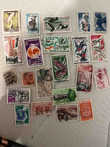 A diverse assortment of approximately 20 vintage postage stamps featuring a wide range of global origins, primarily from African nations and French-administered territories. Notable examples include issues from the Republic of Niger, Ivory Coast (Cote d'Ivoire), Monaco, Chad, and Nigeria. The collection showcases various thematic designs including indigenous wildlife (ibex, birds), the 1964 Tokyo Olympic games, industrial infrastructure, and cultural figures. The stamps are of standard sizes, featuring traditional perforated edges and multi-color lithographic or photogravure printing on gummed paper. Condition appears varied; many stamps exhibit circular date stamps (CDS) and black ink cancellations, indicating they are postally used rather than mint. Visible flaws include some slightly irregular perforations and light creasing typical of age. The manufacturing details span several decades of the mid-20th century, roughly from the late 1940s to the 1970s. Key pieces include high-denomination airmail stamps and colorful 'Europa' issues. The craftsmanship reflects the era's sophisticated engraving techniques, with intricate line work and vibrant, saturated pigments that remain largely clear despite some fading from light exposure.