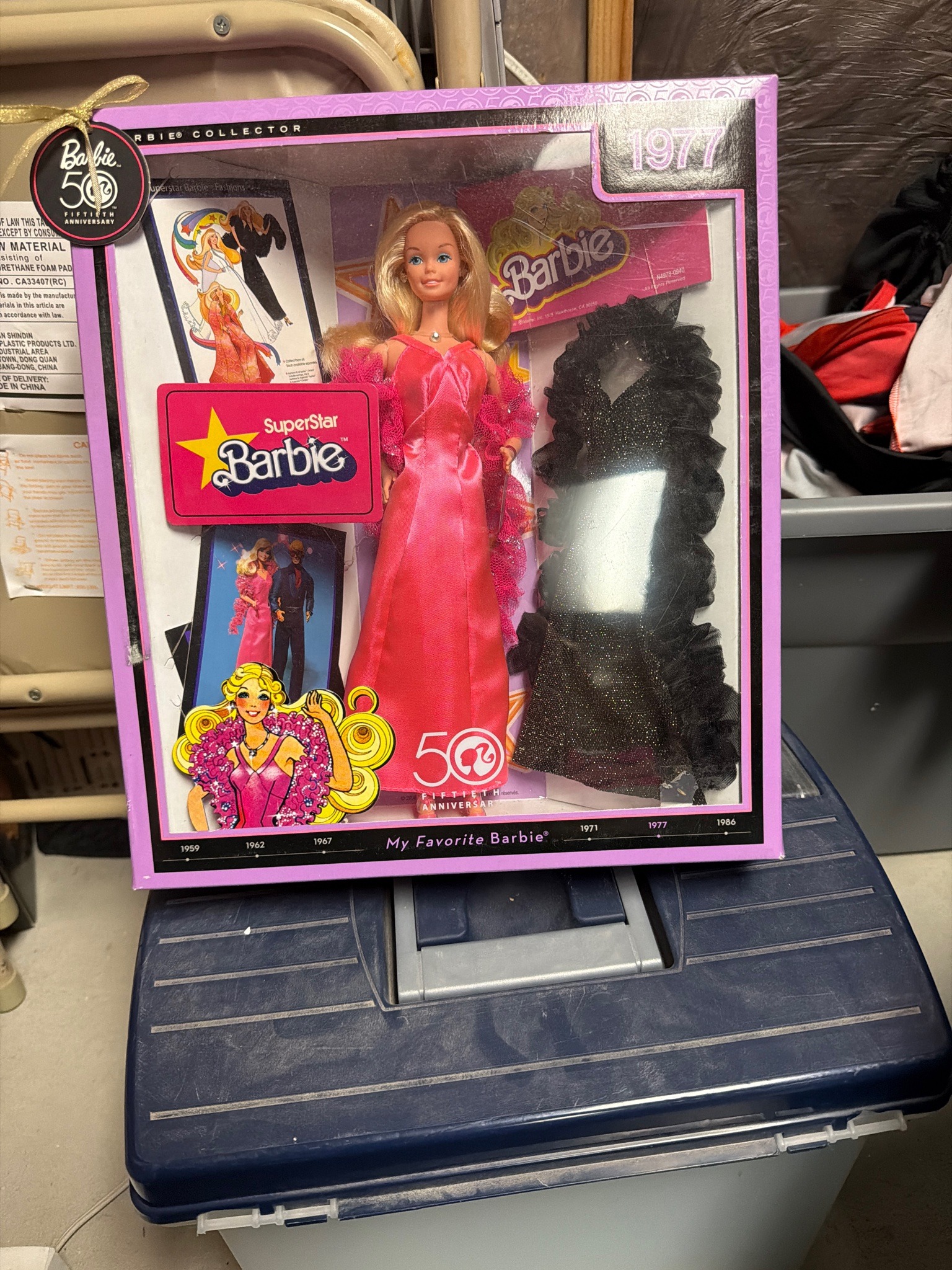 This is a 2009 Mattel Barbie Collector 'My Favorite Barbie' series reproduction of the iconic 1977 SuperStar Barbie. The doll features the classic 1970s 'SuperStar' face mold with blue eyes, painted lashes, and blonde hair styled in signature voluminous waves. She is dressed in a vibrant hot pink floor-length satin gown accessorized with a shimmering pink boa. The set includes a secondary black 'glitter' evening outfit with ruffled detailing. The doll is presented in its original 'Never Removed From Box' (NRFB) condition, featuring a decorative window box with 50th-anniversary branding, a commemorative gold-tone tag, and retro-style graphics. The packaging incorporates a timeline of Barbie milestones from 1959 to 1986. Physically, the doll appears to be in mint condition. The box shows minor shelf wear along the edges and corners, typical for its age, but the clear plastic window remains intact and displays the contents clearly. This reproduction was part of the 'Pink Label' collector series specifically celebrating 50 years of the brand. Notable markings include the Mattel logo and specific model numbers on the rear packaging, though not visible in this front-facing view.