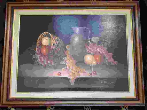 This is a contemporary still life oil painting on canvas, measuring approximately 70x50 cm within its frame. The composition features a traditional arrangement of fruit, including red and green apples nestled in a woven basket, a central gray ceramic pitcher, and cascading bunches of red and yellow grapes across a dark foreground. The background is characterized by a moody, atmospheric use of deep blues, purples, and black, creating a dramatic chiaroscuro effect. The brushwork appears deliberate, with highlights on the fruit providing a sense of volume and texture. There is a discernible signature in the lower right corner, though the specific artist is difficult to identify from the image resolution. The piece is housed in a substantial multi-tiered wooden frame with a gold-toned inner fillet and a light-colored linen liner. The overall condition appears good with no visible craquelure, although the frame shows minor surface abrasions consistent with age. The style suggests a late 20th-century execution, mimicking classical Dutch still life motifs but with a modern tonal palette.