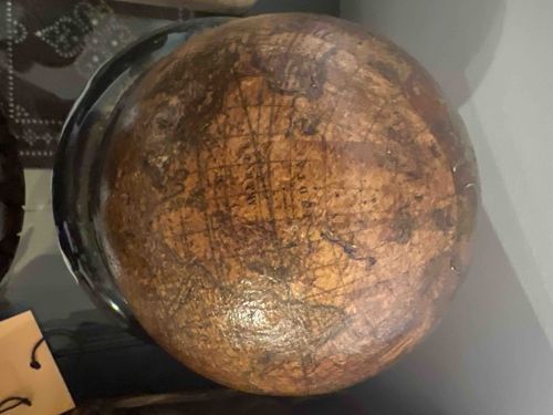 This is an antique terrestrial desk globe, likely dating from the mid-to-late 19th century or early 20th century. The globe features hand-applied paper gores over a plaster and papier-mâché orb. The surface displays a deep, warm amber-brown patina, heavily aged with significant shellac or varnish yellowing. Distinguishable cartographic details include hand-colored outlines and black ink topography, with visible latitude and longitude grid lines. The globe is mounted within a dark metal meridian ring, possibly patinated brass or iron. In terms of condition, the item shows significant honest wear consistent with age, including surface abrasions, minor loss of gores near the poles, and scattered scuffing. There is heavy craquelure across the surface, suggesting a long history in a controlled or varying environment. No visible maker's mark is immediately apparent from this angle, but the typography suggests a European or American origin. The craftsmanship is evident in the alignment of the gores and the overall structural integrity of the orb despite its age.