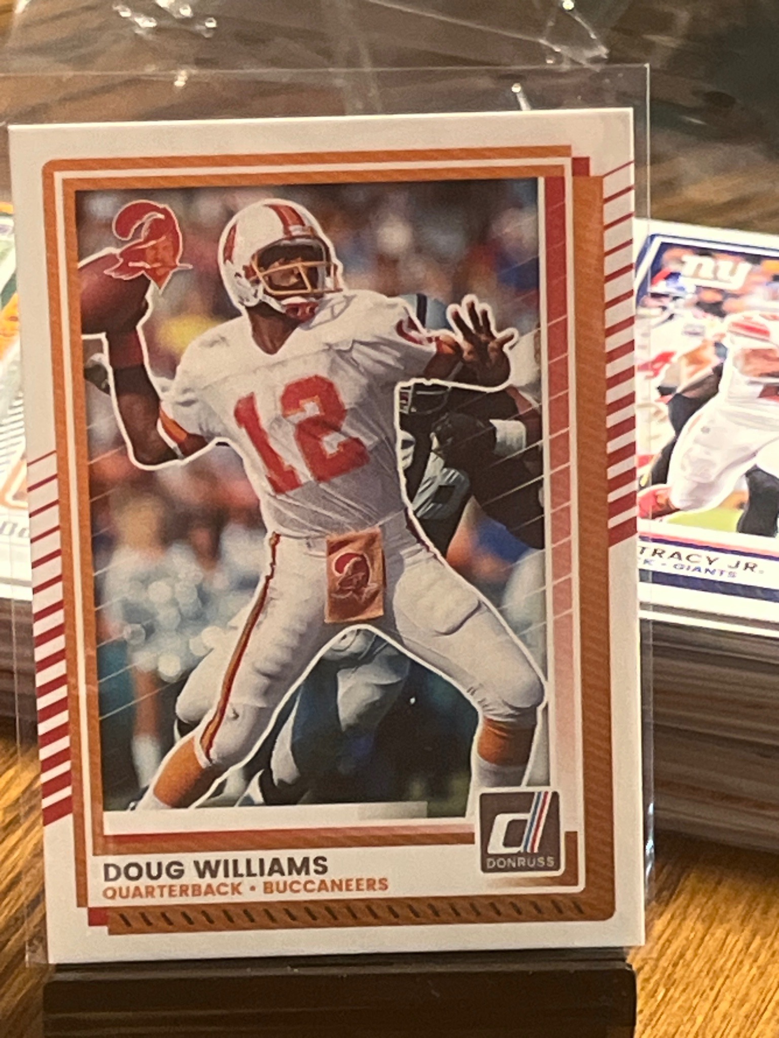 This is a modern 2023 Donruss football card featuring legendary quarterback Doug Williams in his vintage Tampa Bay Buccaneers 'creamsicle' uniform. The card design is a 'retro' throwback style, utilizing a prominent orange and red frame with diagonal striped accents on the left and right borders. Doug Williams is depicted mid-action in a throwing pose, wearing the number 12 jersey and the classic Bucco Bruce helmet. The card is printed on standard semi-gloss cardstock with white borders. Notable features include the classic 1980s-era Donruss 'd' logo in the lower right corner and clear typography for the player name, position, and team at the bottom. The card appears to be in excellent condition, housed in a clear protective plastic sleeve which has preserved the sharp corners and clean edges. The centering on the card looks well-balanced vertically and horizontally. This item is part of a modern set that pays homage to historical NFL players through nostalgic graphic design. There are no visible surface scratches, creases, or discoloration, indicating a high grade for a modern collectible. The background of the image shows other modern cards, including an Lawrence Cager card, suggesting this is part of a recent retail or hobby box break.