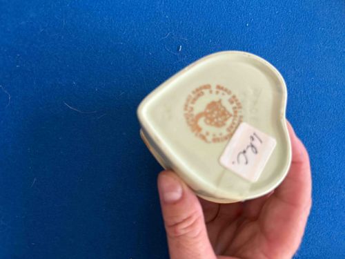 This is a vintage bone china heart-shaped trinket or pill box originating from England. The item is characterized by a pale cream or off-white aesthetic with a rounded, heartform silhouette. The base features a clear backstamp in a reddish-brown ink depicting a floral crest, identifying the maker as 'Radnor Bone China', with the accompanying text 'Hand Made' and 'Made in England'. This stamp is indicative of a mid-20th-century production, likely dating between the 1950s and 1970s. The material is a fine bone china, noted for its delicate density and smooth glazed finish. The construction consists of a shallow vessel with an unglazed rim where a lid would traditionally sit (lid not visible in this view). Looking at the condition, the piece shows some minor surface grime and a paper adhesive label with handwritten notation, which should be carefully removed to avoid residue. There are no immediate signs of large chips or cracks visible on the base, though there appears to be slight shelf wear on the bottom resting rim. The craftsmanship reflects the English pottery tradition of the era, focusing on small-scale decorative giftware.