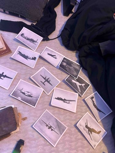 This collection consists of approximately twelve individual black-and-white photographs featuring various World War II-era military aircraft. The images appear to be silver gelatin prints on photographic paper, characterized by a classic monochromatic tonal range and a thin white border. The subjects captured include iconic aircraft such as the Supermarine Spitfire, Hawker Hurricane, and multi-engine bombers like the B-25 Mitchell and Handley Page Halifax, shown in both side-profile and banking maneuvers. These photographs are likely 4x6 or 3x5 inches in size, common for personal snapshots or field recordings during the 1940s. The condition of the prints shows some visible curling at the edges and slight foxing or silver mirroring typical of vintage paper stored in non-archival environments. There is notable corner wear on several items, and the paper stock suggests a production date between 1940 and 1950. The clarity of the silhouettes indicates these may have been used as recognition cards for military training or are personal mementos from a serviceman. While no specific maker's marks are visible on the front, the uniform style and varying sky backgrounds suggest they were taken by an aviation enthusiast or official military photographer during the mid-20th century.
