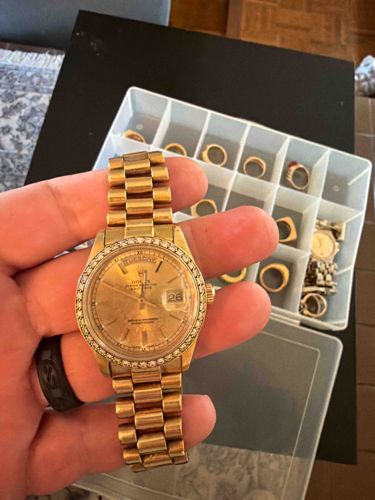 This is a vintage Rolex Day-Date wristwatch, colloquially known as the 'President' model. The timepiece is constructed from yellow gold, featuring the signature three-piece semi-circular link President bracelet with a concealed folding Crownclasp. A notable customization or factory option is the circular brilliant-cut diamond-set bezel surrounding the champagne-toned dial. The dial displays the day of the week in full at the 12 o'clock position and the numerical date under a cyclops magnifying lens at 3 o'clock. The dial appears to have a textured or sunray finish with applied gold hour markers and the iconic Rolex coronet logo. Based on the case shape and dial configuration, this appears to be a five-digit reference model, approximately from the 1980s or 1990s. The condition shows significant signs of wear and age; there is visible 'stretch' in the bracelet links, suggesting heavy use. Surface scratches and minor indentations are present across the gold surfaces, and the crystal appears to have minor edge chips or scratches. The overall patina indicates it has not been recently polished, which collectors often prefer to maintain original case geometry. The craftsmanship reflects the high-precision horological standards of Rolex, though professional authentication is required to verify the movement and diamond setting.