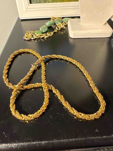 This item is a classic rope-style chain necklace featuring a high-polish yellow gold finish. The necklace is constructed with tightly interwoven metal links that create a spiraling, textured aesthetic characteristic of the rope design. Based on visual inspection, the chain appears to have a significant gauge, approximately 4mm to 6mm in thickness, suggesting it is intended as a statement piece rather than a delicate accent. The color is a vibrant, saturated yellow, which is often indicative of heavy gold plating or 'gold-filled' construction over a base metal like jeweler's brass or sterling silver. The necklace is secured with a traditional lobster claw clasp, which shows a slightly different finish than the main body, potentially indicating a replacement or a different metal composition for the mechanism. The condition is generally good with high shine, although minor surface scratches and faint signs of tarnish are visible near the clasp ends. There are no obvious maker's marks visible in the photograph, but the style is consistent with late 20th-century jewelry fashion, specifically the 1980s or 1990s. The craftsmanship shows consistent link geometry and a smooth drape, reflecting mid-range commercial jewelry quality.