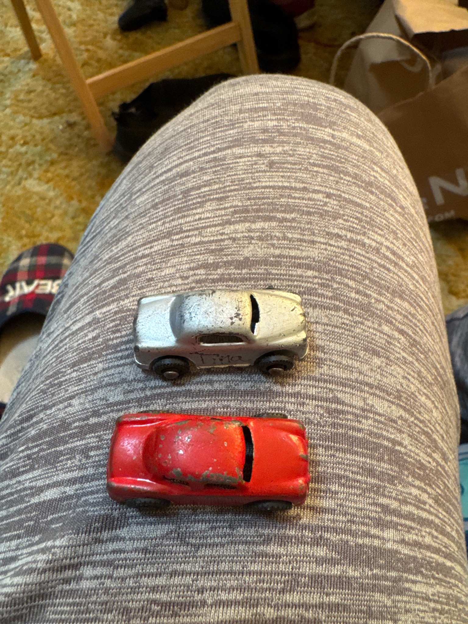 This is a pair of vintage die-cast metal toy cars, specifically identified as 'Midget' series vehicles manufactured by Tootsietoy (Dowst Mfg. Co.). Measuring approximately 1.5 inches in length, these miniature models represent late 1930s to early 1940s automotive styling, characterized by a rounded, streamlined 'airflow' aesthetic. The set includes one car in a silver metallic finish and one in a primary red finish. Both items are constructed from a single-piece cast lead or zinc alloy body with a hollow underside. They feature black wooden or composite wheels fixed on simple metal axles. The silver car shows significant finish loss across the roof and fenders, with visible surface oxidation and a handwritten 'Tina' inscription on the passenger side. The red car exhibits heavy paint chipping and 'play-wear' along the raised edges and roofline, revealing the dull grey metal beneath. Common for toys of this era, the casting is simple with minimal interior detail, focusing on the exterior silhouette. These micro-sized 'cracker jack' style toys were popular mid-century giveaways and pocket toys, and their well-loved condition indicates extensive historical use.