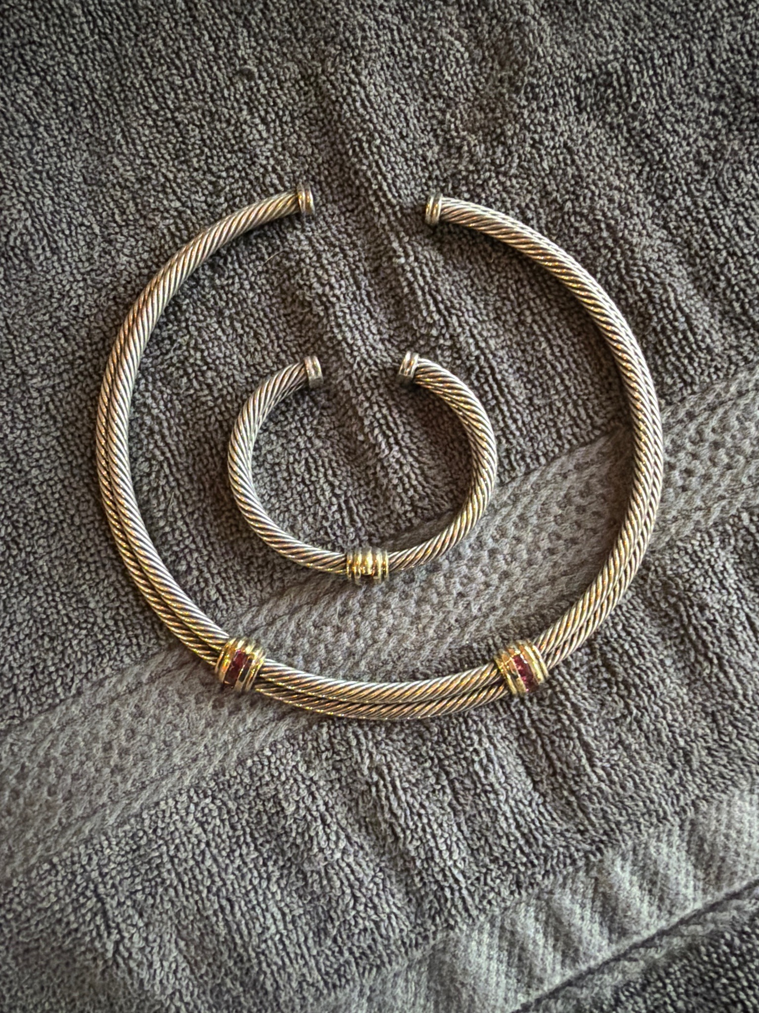 A high-quality two-piece jewelry set consisting of an open-set collar necklace and a matching cuff-style bangle bracelet. Both items feature David Yurman's signature twisted cable motif, crafted from sterling silver. The necklace is embellished with two decorative stations featuring gold bands—likely 14K or 18K yellow gold—accented with central pink-hued gemstones, which appear to be either tourmaline or rhodolite garnets. The bracelet features a central gold-banded station and similar sterling silver end-cap finials. The construction is heavy and substantial, indicative of fine designer jewelry. The silver tracks show a deep oxidation within the recesses of the cable twist, which provides a high-contrast patina typical of this style. There are minor surface scratches and faint signs of tarnish consistent with authentic sterling silver that has been moderately worn. The gold accents appear vibrant and show no signs of plating wear, suggesting they are solid gold components rather than gold-filled. This aesthetic is characteristic of late 20th-century luxury designer fashion. While the hallmark is not visible in the image, the craftsmanship, material combination, and weight of the cable design strongly suggest a mid-to-high-end jewelry house production.
